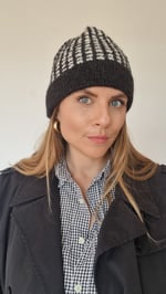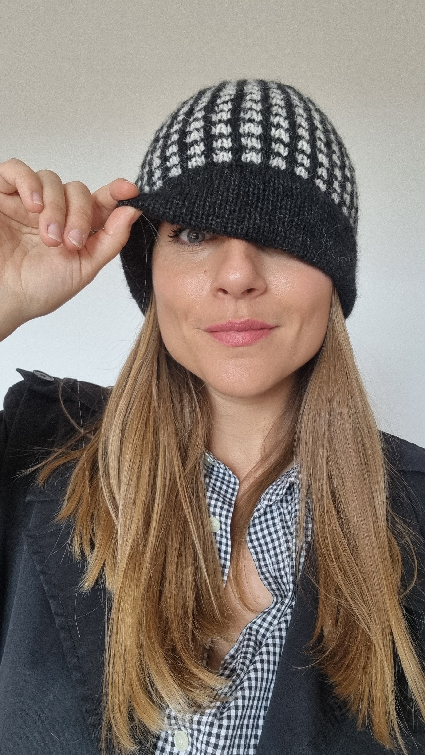 Ce bonnet est tricoté en utilisant la technique des mailles glissées pour obtenir ce joli point vichy petits carreaux. On jongle avec les 2 fils de deux couleurs différentes.